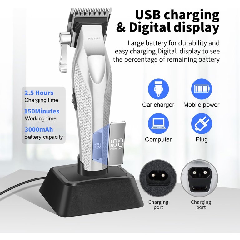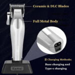 زمان کاردهی طولانی: با تنها ۲ تا ۳ ساعت شارژ کامل، دستگاه تا ۱۵۰ دقیقه کارکرد مداوم را تضمین می‌کند. این زمان برای انجام چندین اصلاح حرفه‌ای پیوسته در سالن‌های شلوغ یا استفاده‌های خانگی طولانی مدت، کاملاً کافی است.